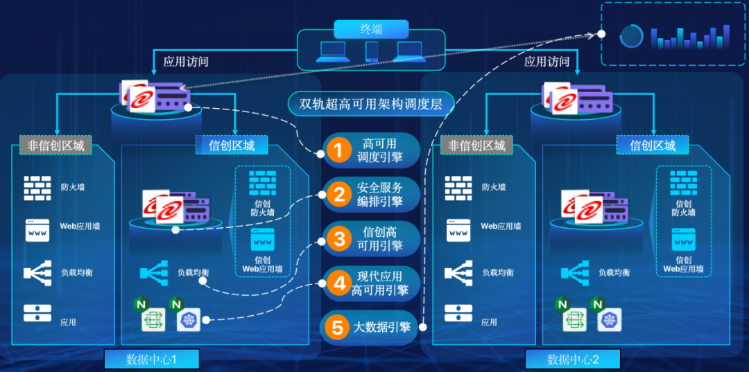 雙軌超高可用架構(gòu)擁有五大引擎,分別是:高可用調(diào)度引擎、安全服務(wù)編排引擎、現(xiàn)代應(yīng)用高可用引擎、信創(chuàng)高可用引擎、大數(shù)據(jù)引擎,可以幫助客戶(hù)在新架構(gòu)下, 提升應(yīng)用可持續(xù)性,解決性能瓶頸,提升穩(wěn)定性。在服務(wù)異常情況下,可以通過(guò)實(shí)時(shí)灰度調(diào)度的方式,實(shí)現(xiàn)業(yè)務(wù)的應(yīng)急逃生,保留應(yīng)用故障現(xiàn)場(chǎng)環(huán)境,便于后續(xù)的排錯(cuò)與根因定位。