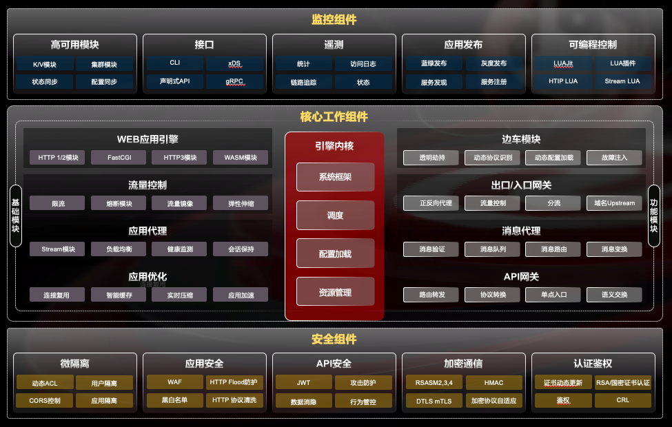 OpenNJet應(yīng)用引擎是面向互聯(lián)網(wǎng)和云原生應(yīng)用提供的運(yùn)行時(shí)組態(tài)服務(wù)程序。具備環(huán)境感知、安全控制、加速優(yōu)化等能力,可利用動(dòng)態(tài)加載機(jī)制實(shí)現(xiàn)不同的產(chǎn)品形態(tài),如API網(wǎng)關(guān)、消息代理、入口/出口控制器、邊車(chē)、負(fù)載均衡和WAF等。