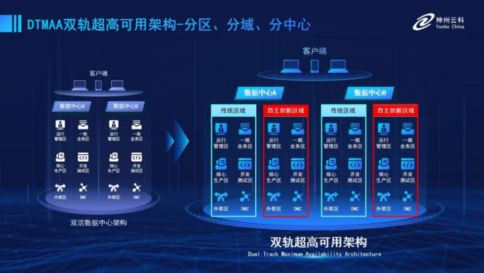 為幫助金融客戶更好地應(yīng)對(duì)數(shù)字經(jīng)濟(jì)時(shí)代對(duì)可持續(xù)性的高要求,實(shí)現(xiàn)“信創(chuàng)”與“數(shù)字化”齊頭并進(jìn),leyu.樂魚推出了雙軌超高可用架構(gòu)。該架構(gòu)在雙活數(shù)據(jù)中心的分區(qū)調(diào)度基礎(chǔ)上,增加信創(chuàng)域和非信創(chuàng)域的分域調(diào)度,實(shí)行信創(chuàng)域與傳統(tǒng)域應(yīng)用全量部署,使雙中心運(yùn)營變?yōu)殡p中心四區(qū)域并行運(yùn)行,互為多活,將“0到1”的單軌建設(shè)道路變?yōu)榉謪^(qū)分域協(xié)同的多活雙軌超高可用架構(gòu)。幫助客戶在新架構(gòu)下,保障“信創(chuàng)”的同時(shí)解決性能瓶頸,提升穩(wěn)定性,保證應(yīng)用可持續(xù)性,最終實(shí)現(xiàn)信創(chuàng)區(qū)域和非信創(chuàng)區(qū)域的平滑過渡,完成國產(chǎn)化替代目標(biāo)。
