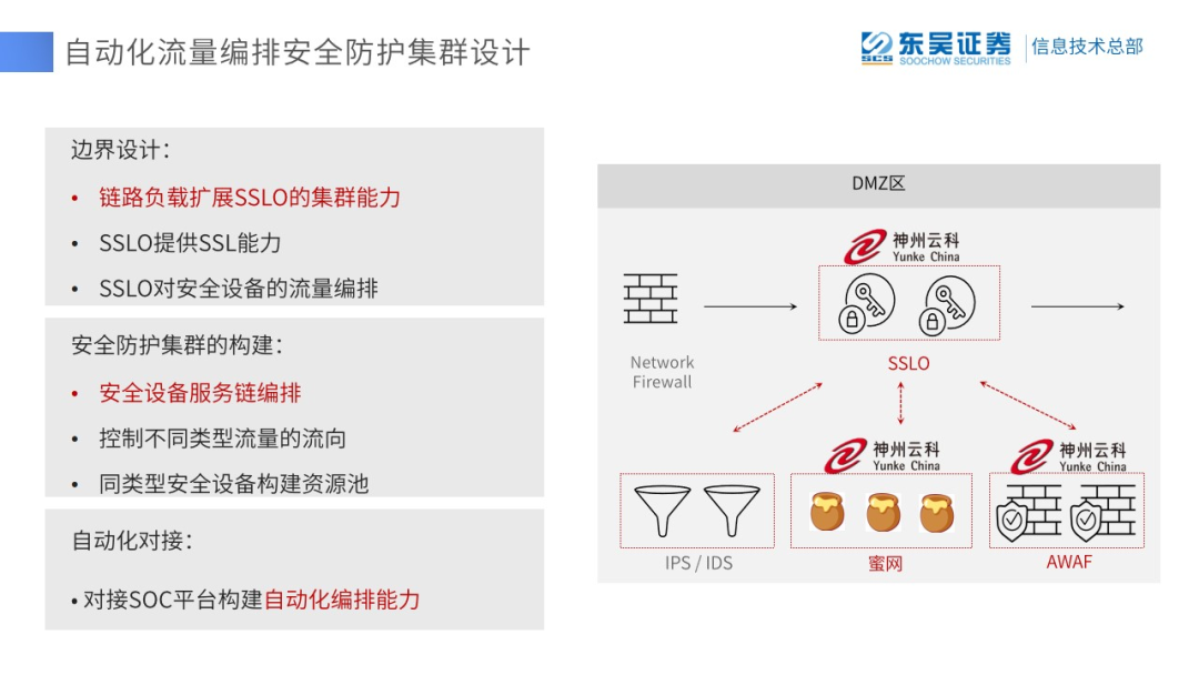 為了更好的應(yīng)對數(shù)據(jù)安全挑戰(zhàn),滿足監(jiān)管需求,保障應(yīng)用可持續(xù)性,東吳證券采用leyu.樂魚安全流量編排解決方案。將原有串接部署的DDoS、防火墻、WAF、防毒墻、以及旁路的IDS,邏輯旁路部署在安全流量編排設(shè)備旁邊,使安全能力服務(wù)化。